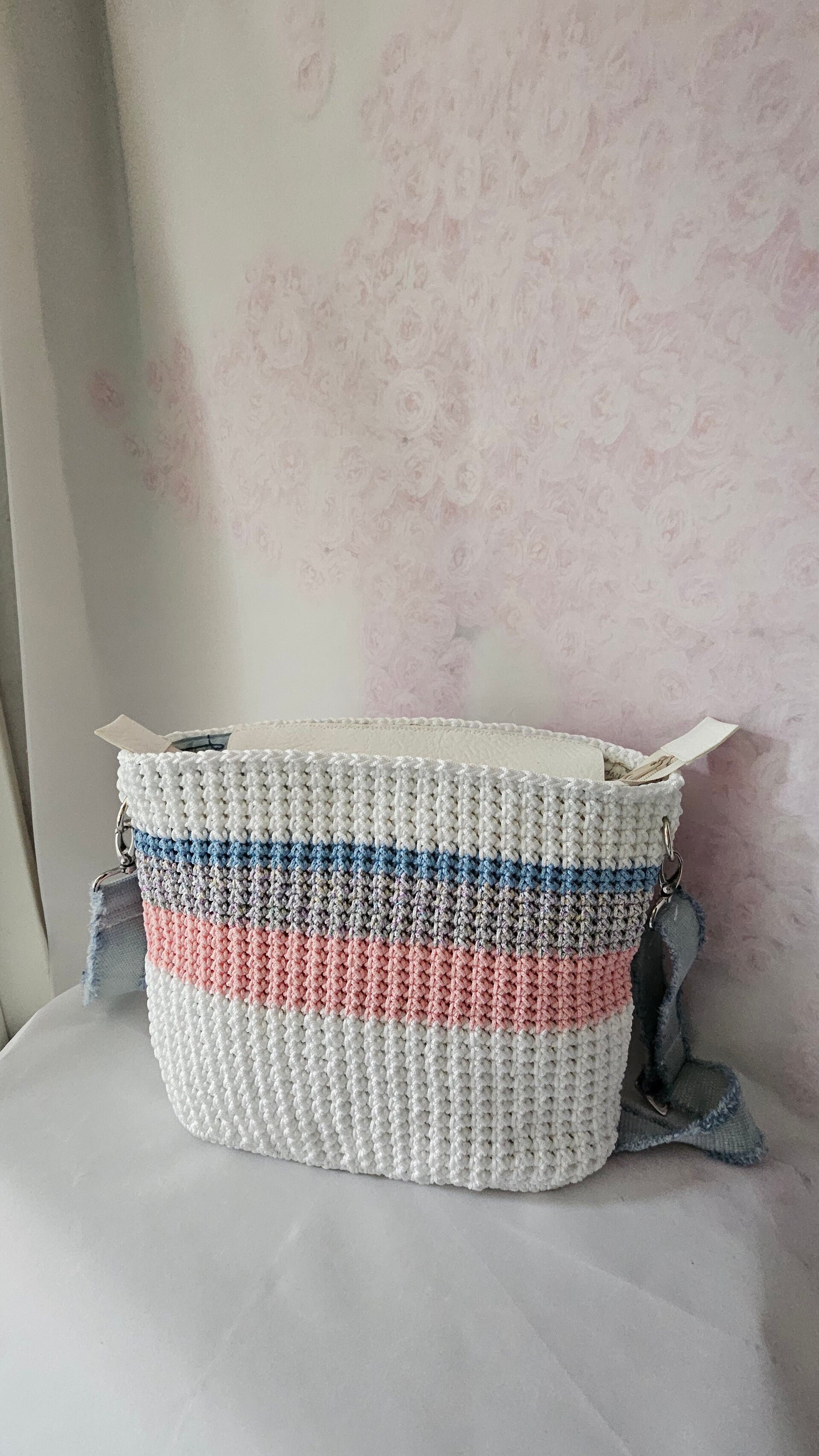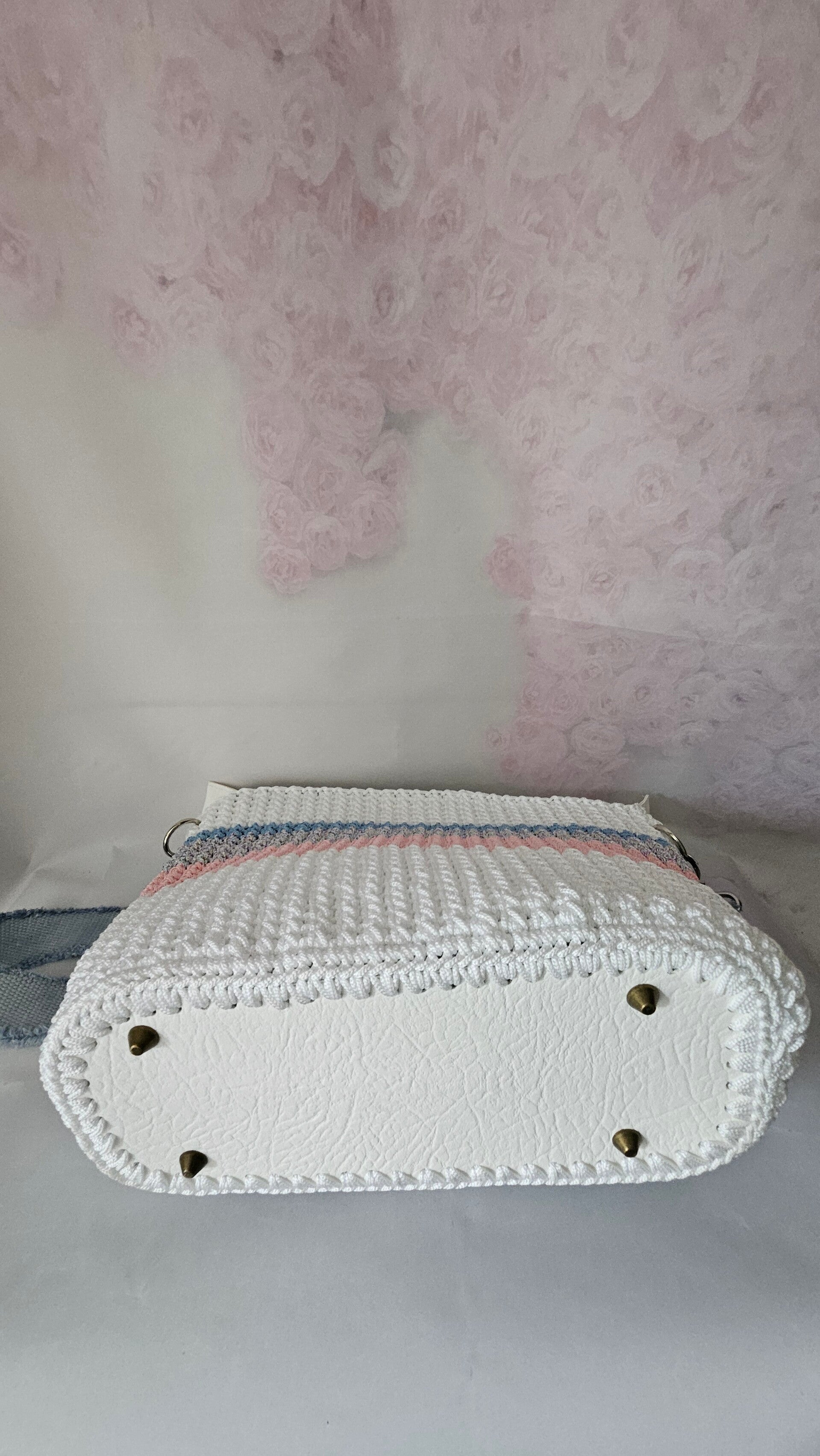 Vollständig gehäkelt aus weißem, rosafarbenem und hellblauem Garn – feminin, frisch und sommerlich.