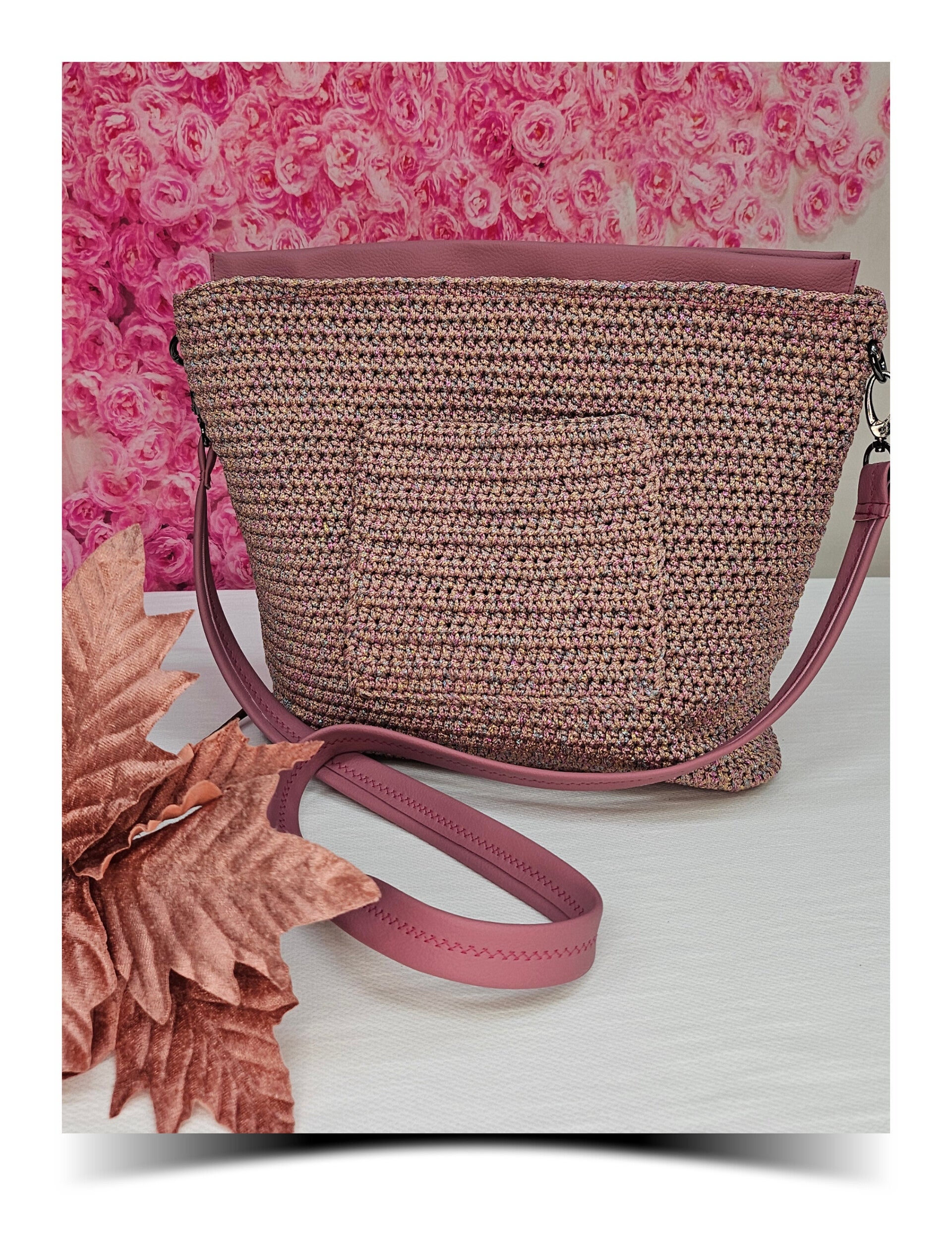 Die handgefertigte Luminda Feder Tasche in zartem Rosa-Glitzer ist ein absoluter Hingucker für alle, die feminine Eleganz und liebevolle Details lieben. Die dekorative Feder wurde sorgfältig im Makramee-Stil gefertigt und verleiht der Tasche einen einzigartigen, verspielten Charme.