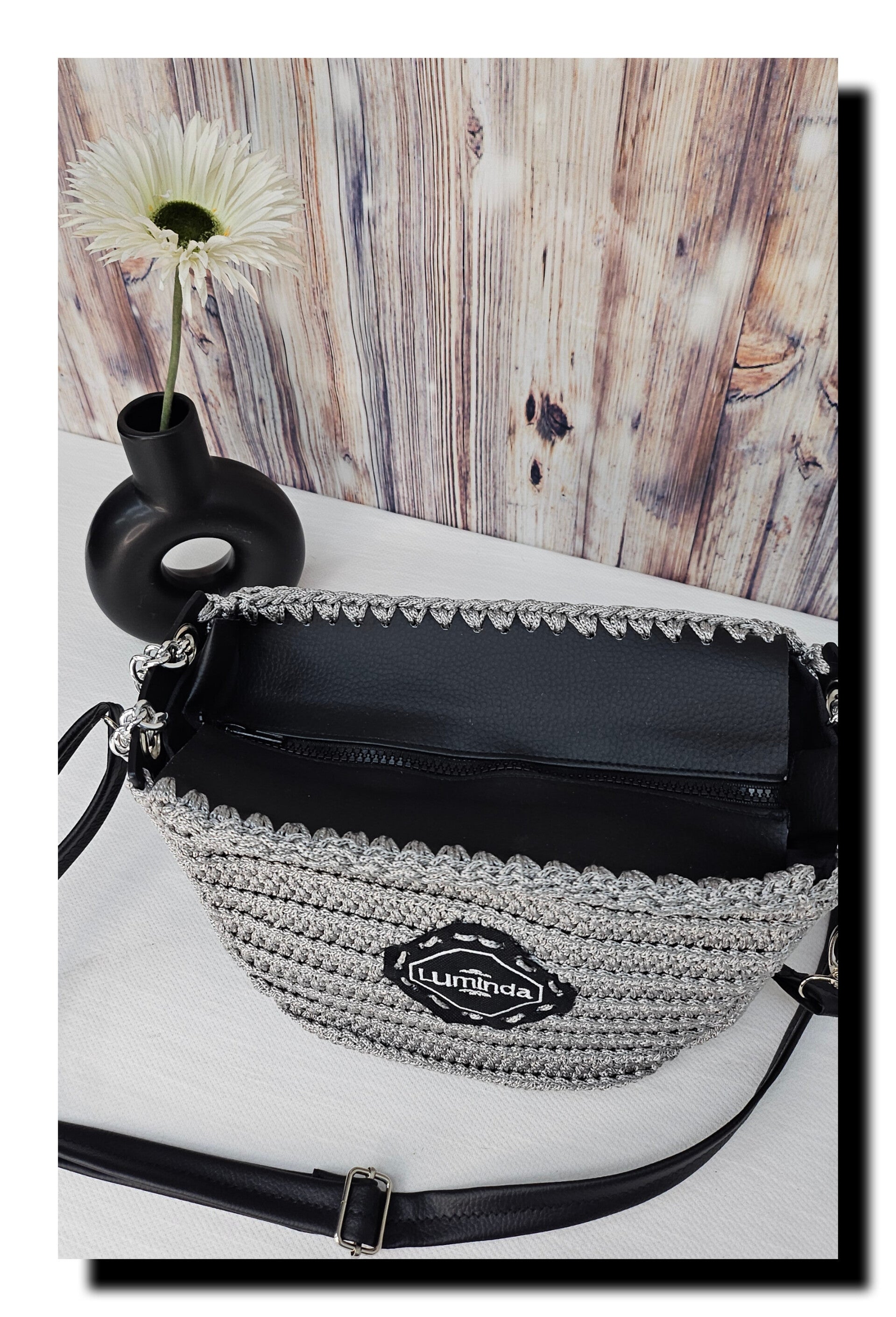 Diese edle Tasche wird aufwendig in silber gehäkelt und seitlich durch schwarzes Kunstleder ergänzt, was ihr einen stabilen, hochwertigen Look verleiht. Der untere Teil des Taschengurtes ist zusätzlich mit einer metallischen Kette verbunden – ein echter Hingucker.