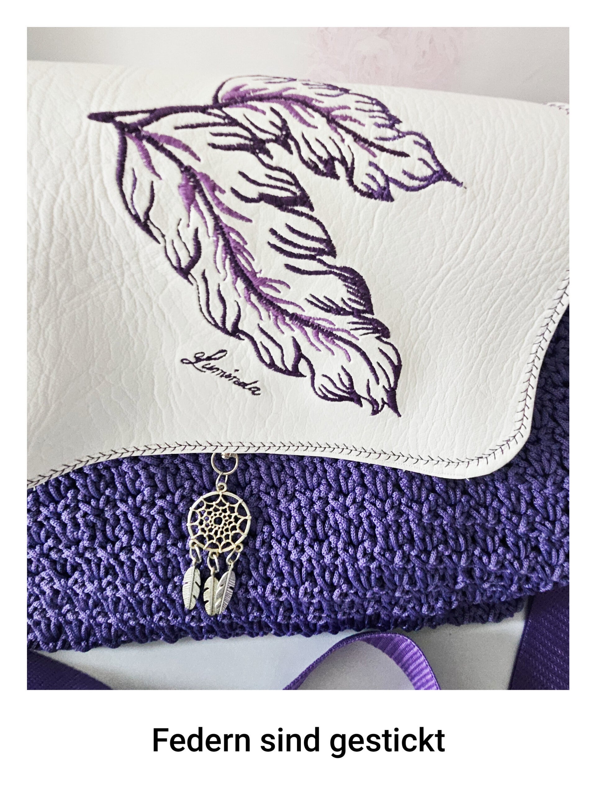 Die Luminda Tasche Liliane besticht durch ihre wunderschöne lilane Häkeloptik, die sofort ins Auge fällt. Die weiße Taschenklappe wird durch zwei fein gestickte Federn verziert – ein elegantes Detail, das diese Tasche zu einem echten Hingucker macht.