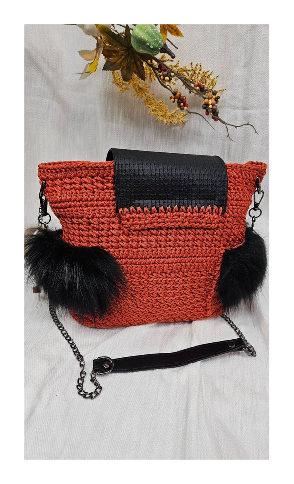 Die Luminda Kupferflausch verbindet kräftiges Design mit weicher Eleganz. Das orangefarbene, sorgfältig gehäkelte Hauptmaterial wird durch edles schwarzes Kunstfell ergänzt – ein moderner Look mit einer angenehm weichen Haptik.