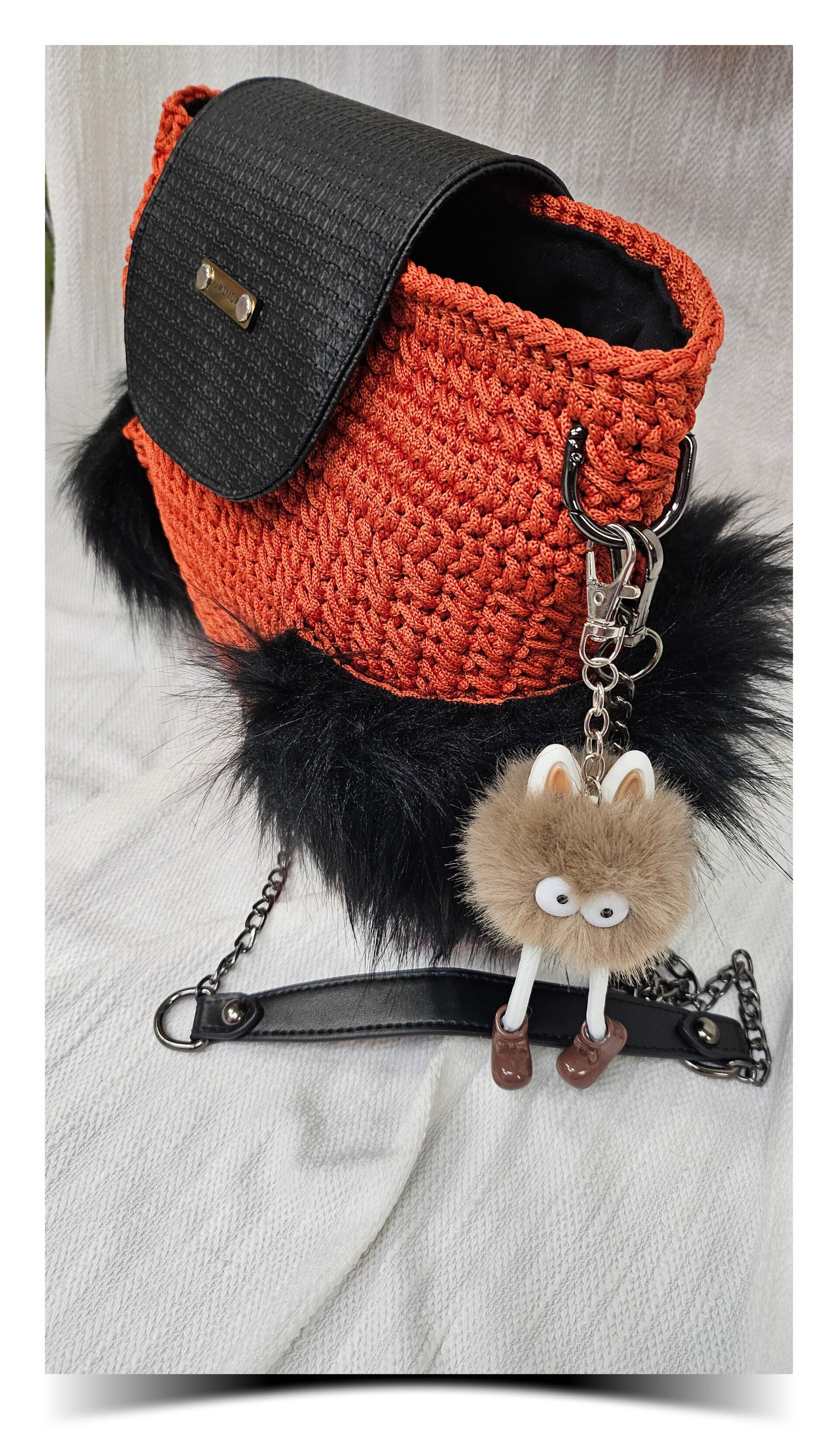 Die Tasche wurde in aufwendiger Handarbeit gehäkelt- in einem Kupferton der perfekt für den Herbst passt. An den Seitentaschen sorgt weiches Kunstfell für einen besonders luxuriösen Look und eine angenehme Haptik.Der Boden ist aus hochwertigem Kunstleder in schwarz erstellt und hat vier Füsschen für bessere Stabilität.Innen überzeugt sie mit einem Baumwollfutter,einer praktischen Innentasche mit Reißverschluss und einem Karabinerhaken für Schlüssel oder kleine Accessoires.Die Taschenklappe mit Magnetverschluss rundet das Design elegant ab.Jede Luminda Tasche ist ein handgefertigtes Unikat.