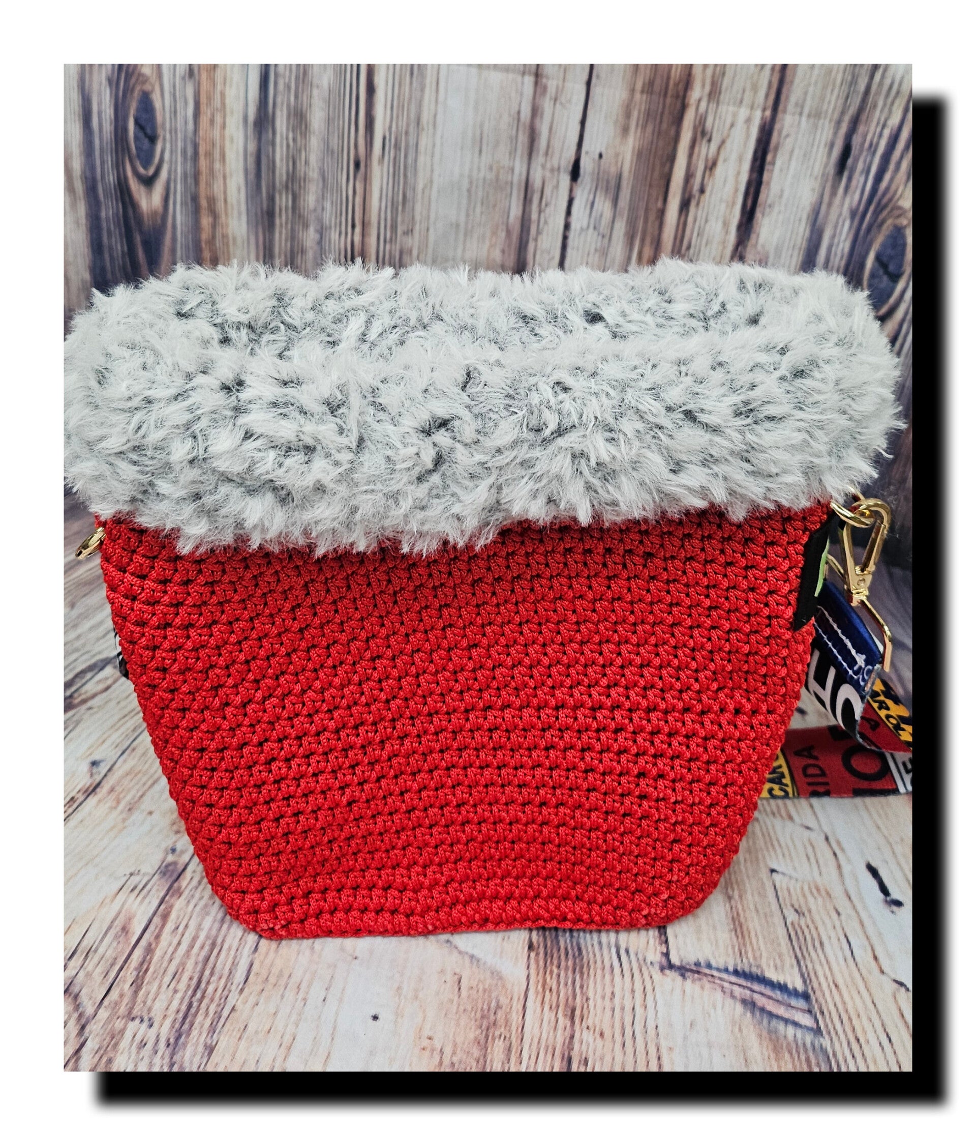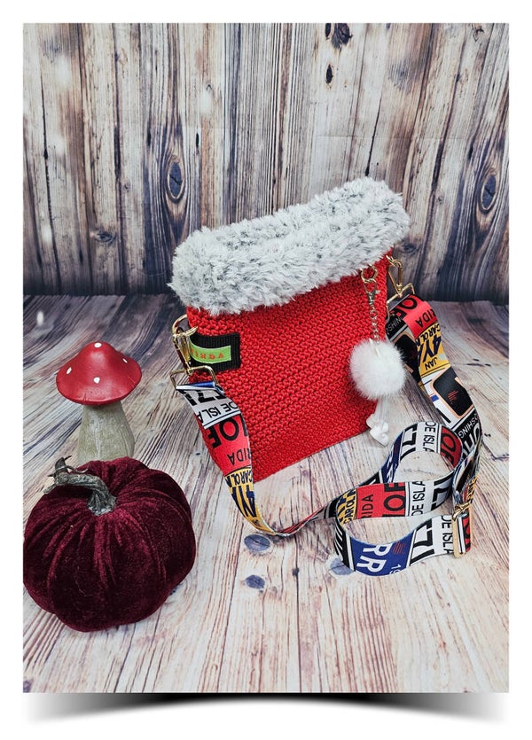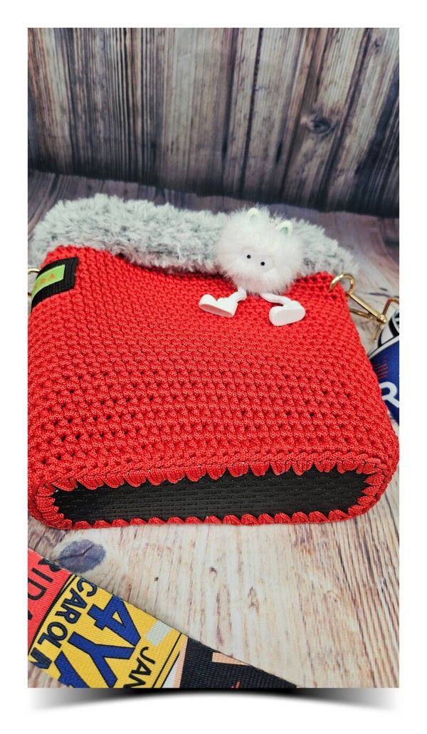 Diese kleine handgefertigte Luminda Tasche vereint elegantes Design,hochwertige Materialien und detailverliebte Handarbeit. Das rote Häkelmuster aus rotem Garn trifft auf weiches Kunstfellgarn in grau-weiß, das der Tasche einen modernen,flauschigen Look verleiht-perfekt für den Herbst und Winter.Der Boden ist aus robusten schwarzen Kunstleder und sorgt für zusätzliche Stabilität. Das Innenfutter ist aus einem gemustertem Baumwollstoff und mit einem Innenfutter mit Reißverschluss versehen. Ein seitlicher Karabinerhaken bietet Platz für Schlüssel oder Anhänger.
