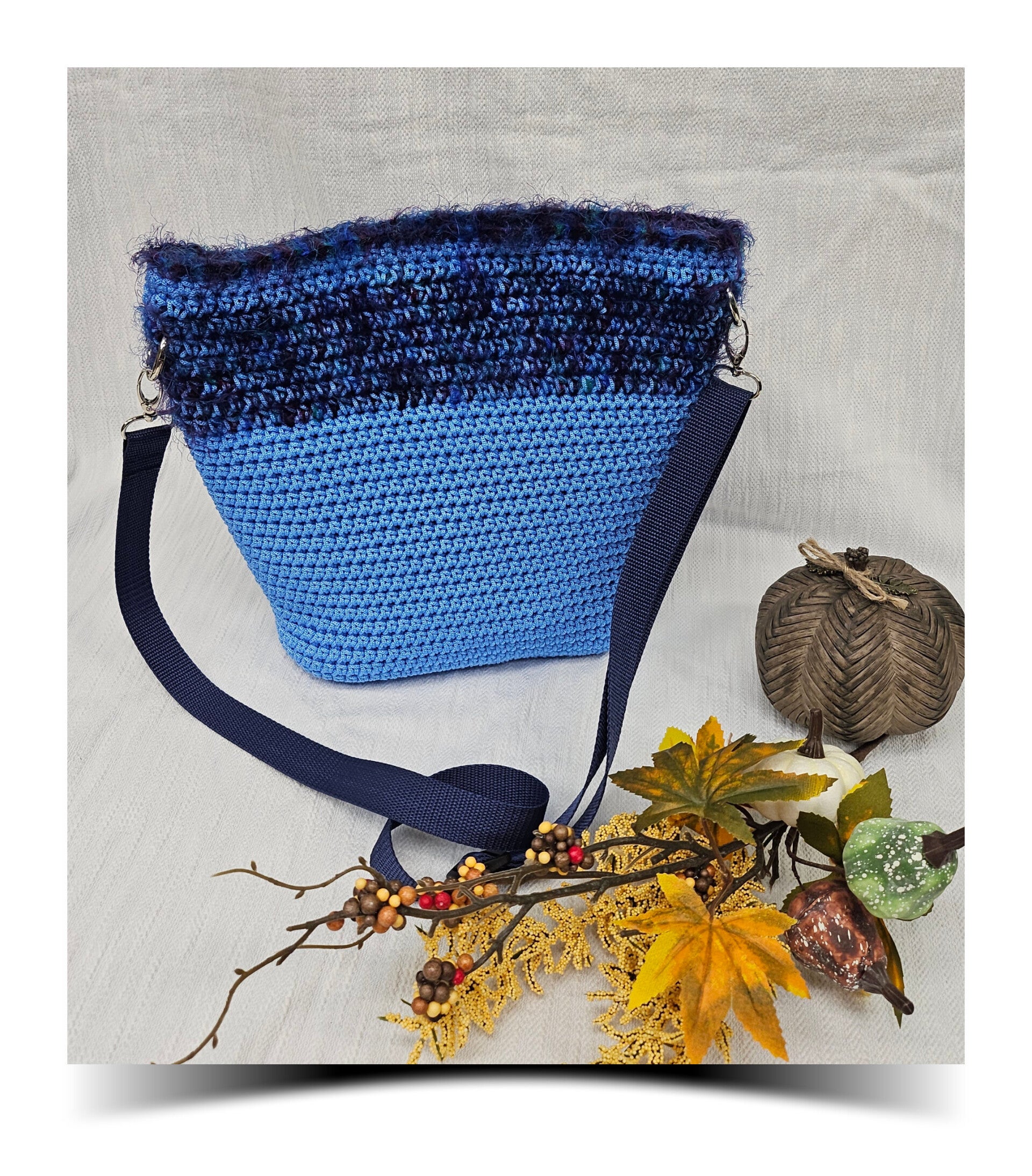 Die Blue Harmony ist eine liebevoll gehäkelte Tasche in einem zarten Hellblau, veredelt mit einem kuschelig weichen oberen Teil aus dunkelblauer Wolle. Die harmonische Mischung der Blautöne und Lilatöne erinnert an einen klaren Himmel über tiefem Wasser – sanft, beruhigend und stilvoll.