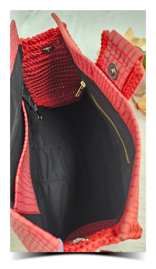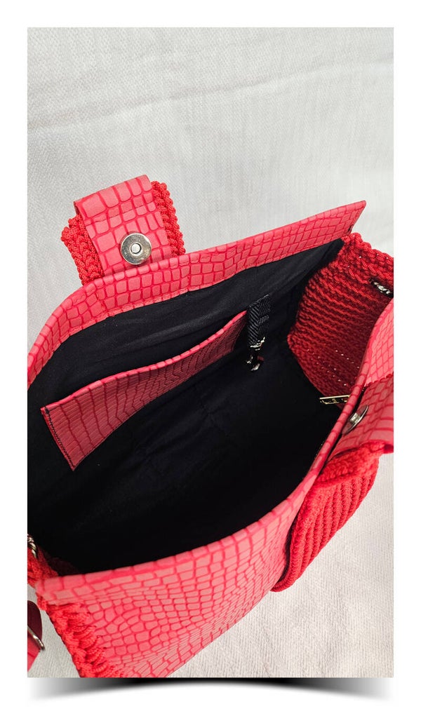 Blütenrot ist eine ausdrucksstarke, handgefertigte Tasche, die Leidenschaft und Eleganz vereint. Die Seiten und die mittlere Fläche sind sorgfältig in kräftigem Rot gehäkelt und werden ringsherum von hochwertigem rotem Kunstleder eingerahmt. Diese Kombination verleiht der Tasche Tiefe, Stabilität und einen besonders edlen Look.